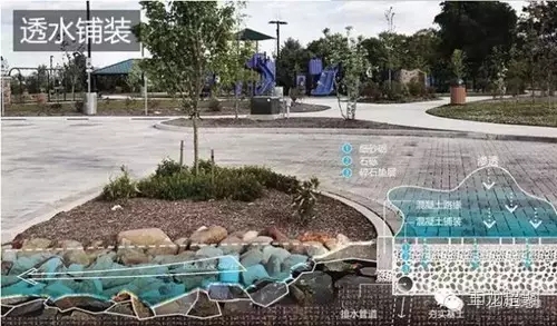 除了設(shè)于綠地的雨水管理措施,在硬質(zhì)地面可以通過(guò)透水鋪裝實(shí)現(xiàn)雨水滲透,或通過(guò)水渠和溝槽將雨水引流至街道附近的滯留設(shè)施中,凈化的雨水可以就地消化于水景觀中,打造互動(dòng)的親水景觀。