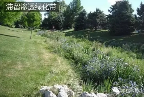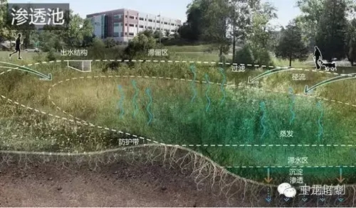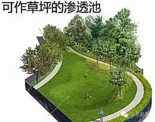 如果說(shuō)以上的幾個(gè)措施都更適用于綠化空間較小的區(qū)域,那么滲透池則適用于綠地面積較大的開闊空間,滲水池能有效地削減徑流峰值,補(bǔ)充地下水。同時(shí)可以設(shè)計(jì)為草坪綠地,在天氣晴朗的時(shí)候供居民放松。