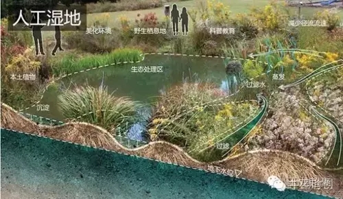 與滲透池規(guī)模相近但功能不同的人工濕地是對(duì)雨水調(diào)蓄與凈化的措施。其可以將雨水花園、植草溝等措施收集的雨水進(jìn)行集中凈化,與其他處理手法一起形成多功能的雨水調(diào)蓄系統(tǒng),打造怡人的濕地景觀。